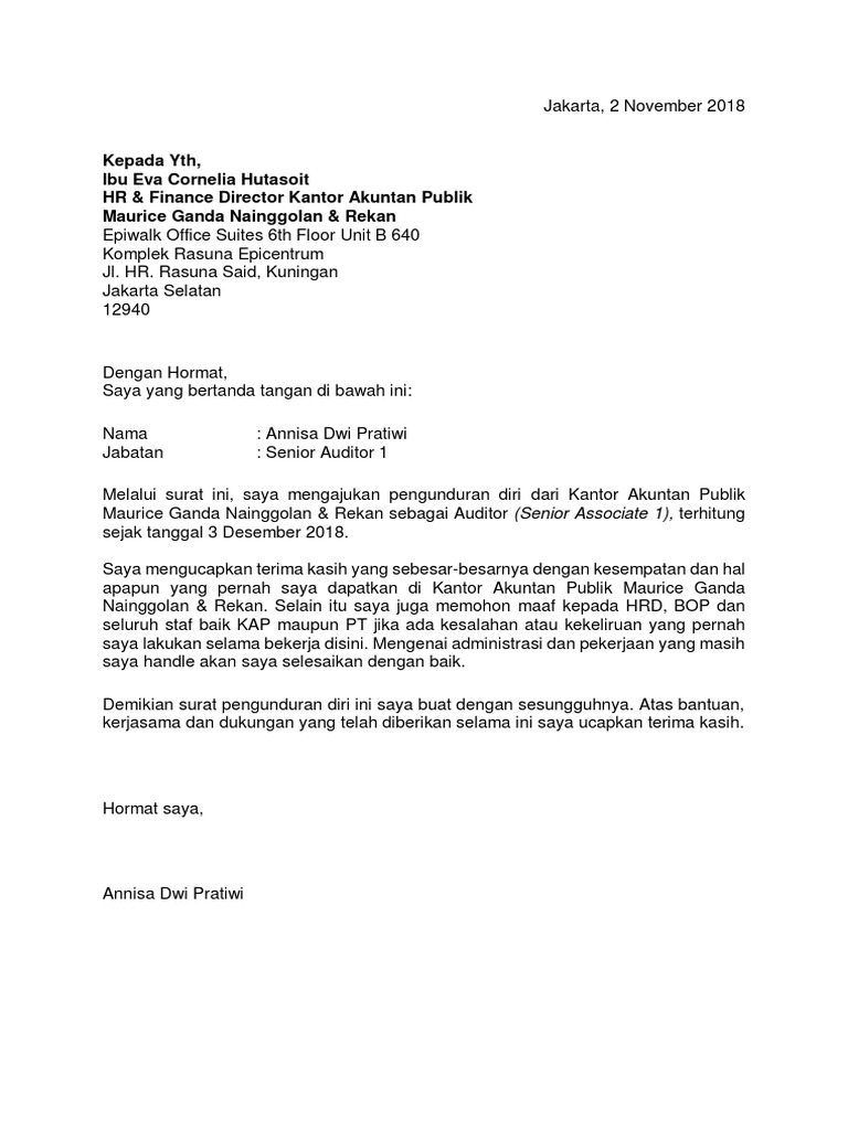Sample 1 - Auditor Resignation Letter. Rangkai kata-kata agar terdengar sopan dan penuh hormat. Jakarta 29 Desember 2020.